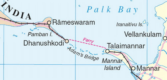 Seperti yang dikutip dari versesofuniverse.blogspot.com, Sri Lanka mungkin dulunya bukanlah sebuah pulau – sebuah rantai kapur betting yang disebut Ram Setu atau Pamban Bridge menjadi bukti samar adanya bekas sambungan daratan antara pulau Mannar barat laut Sri Lanka dan Rameswaram di pantai barat daya India. Dengan 3 ft 30 ft kedalaman laut disekitar jembatan yang memiliki panjang sekitar 30 mil (48 km) ini, tidak cukup baik dan memungkinkan navigasi yang tepat. Sebelumnya dulu ada layanan feri reguler antara Talaimannar Sri Lanka dan Rameswaram India, yang saat ini dihentikan karena kekacauan sipil yang terus berlangsung di Sri Lanka.