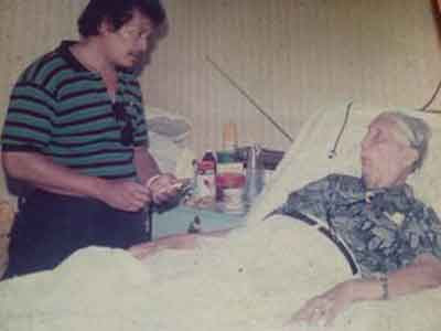 Kepala Kepolisian Negara Raden Said Soekanto Tjokrodiatmodjo (kanan) dirawat di Rumah Sakit Polri, Jakarta, circa 1991. Soekanto ditemani keponakannya, Raden Soelaiman Soepardi Tjokrodisaputro. Photografer Dok. Istimewa